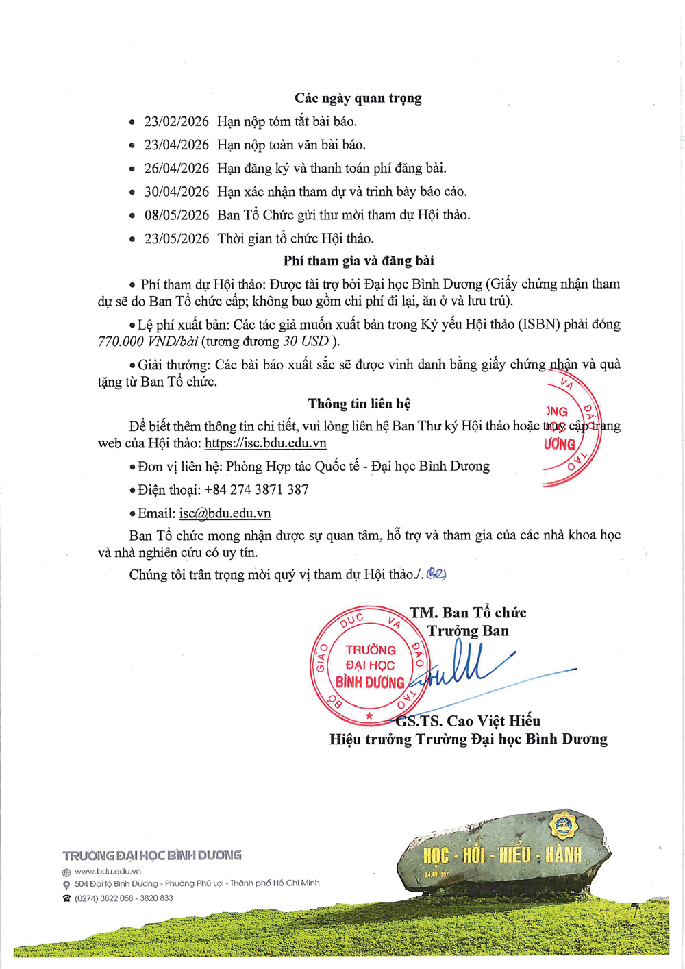 Trong bối cảnh toàn cầu hóa ngày càng sâu rộng cùng những chuyển dịch mạnh mẽ về kinh tế, công nghệ và văn hóa trên toàn thế giới, nghiên cứu khoa học đóng vai trò then chốt trong việc thúc đẩy phát triển bền vững và thực hiện trách nhiệm xã hội. Để đồng hành cùng những biến đổi này, Trường Đại học Bình Dương trân trọng tổ chức Hội thảo Khoa học Quốc tế ISC 2026 với chủ đề "Thúc đẩy nghiên cứu khoa học và phát triển Kinh tế, Công nghệ và Văn hóa đương đại tại Việt Nam".