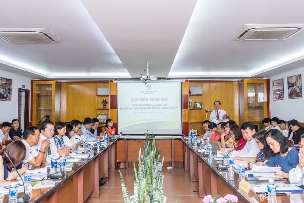 Nhằm tạo diễn đàn trao đổi khoa học pháp lý ứng dụng giữa các chuyên gia, nhà quản lý với cộng đồng doanh nghiệp và dự báo các tác động của Bộ luật Lao động 2019 đối với doanh nghiệp, sáng 31/10, tại Hội trường A1, Trường Đại học Bình Dương đã diễn ra hội thảo khoa học với chủ đề “Đánh giá những tác động của Bộ luật Lao động 2019 đối với doanh nghiệp” do Khoa Luật học tổ chức.