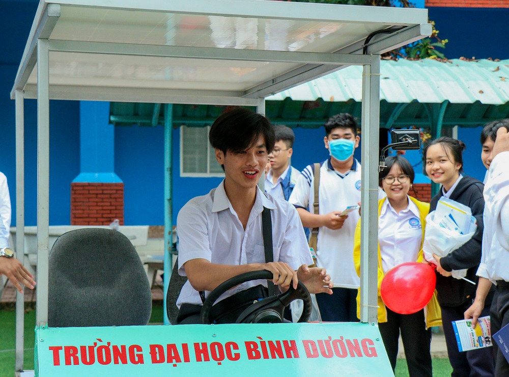 Đặc biệt, tại gian hàng của Trường Đại học Bình Dương, các bạn học sinh đã có dịp trải nghiệm và tự lái thử xe ôtô chạy bằng năng lượng mặt trời do sinh viên Khoa Công nghệ kỹ thuật ô tô Nhà trường sáng chế.