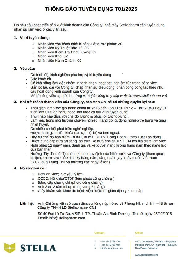Nhà máy Stellapharm tuyển dụng tháng 10-2025